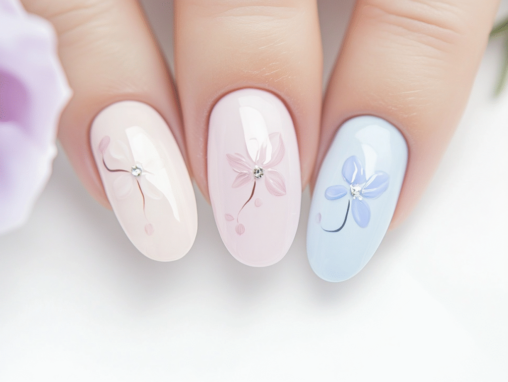 Spring pastel florals combine soft colors with delicate flower designs. This style uses shades like baby pink, lilac, and milky blue to create a gentle, fresh look. These colors suit all nail shapes but work especially well on short nails.