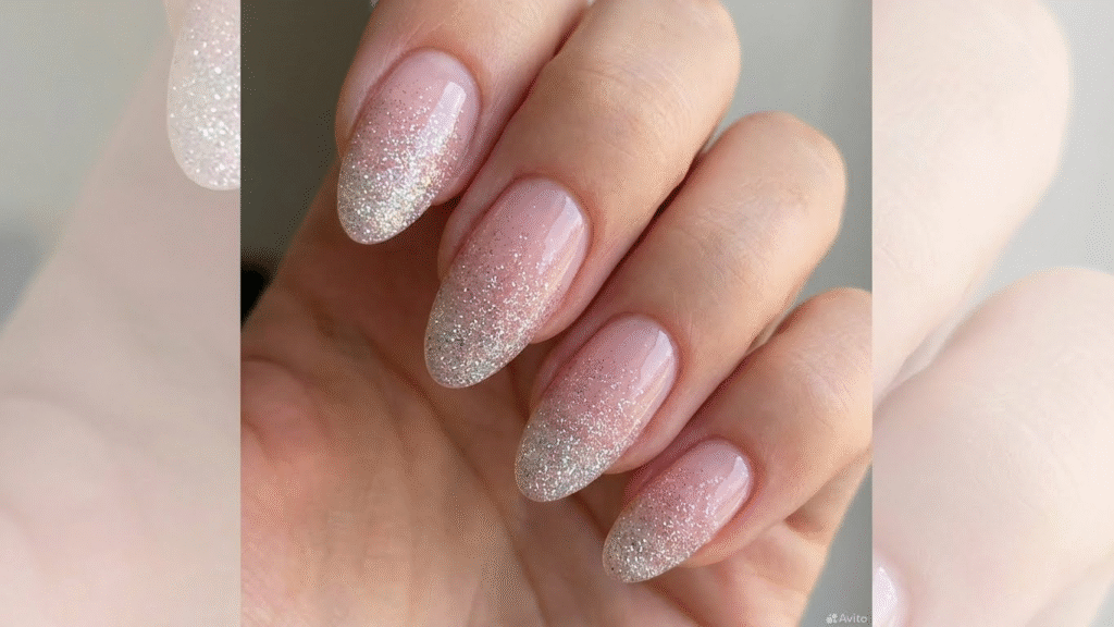 Subtle glitter gradients offer a soft and elegant way to add sparkle to nails. The look usually starts with a natural or light-colored base. Then, fine glitter is gently applied from the tips or just above, fading down toward the base.