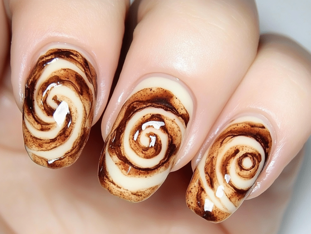 Cinnamon swirl nails are a popular choice for fall. They feature a creamy base color with brown swirls that mimic the look of cinnamon rolls. This design creates a warm and cozy feel perfect for autumn.