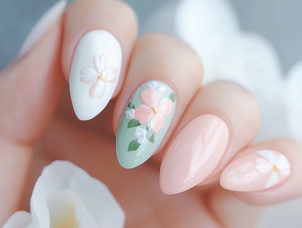 Florals add a natural touch that fits the season. Simple flower patterns or small blossoms can be placed on one or two nails for an elegant effect. Some designs mix pastel shades on each nail, giving a playful yet polished appearance.