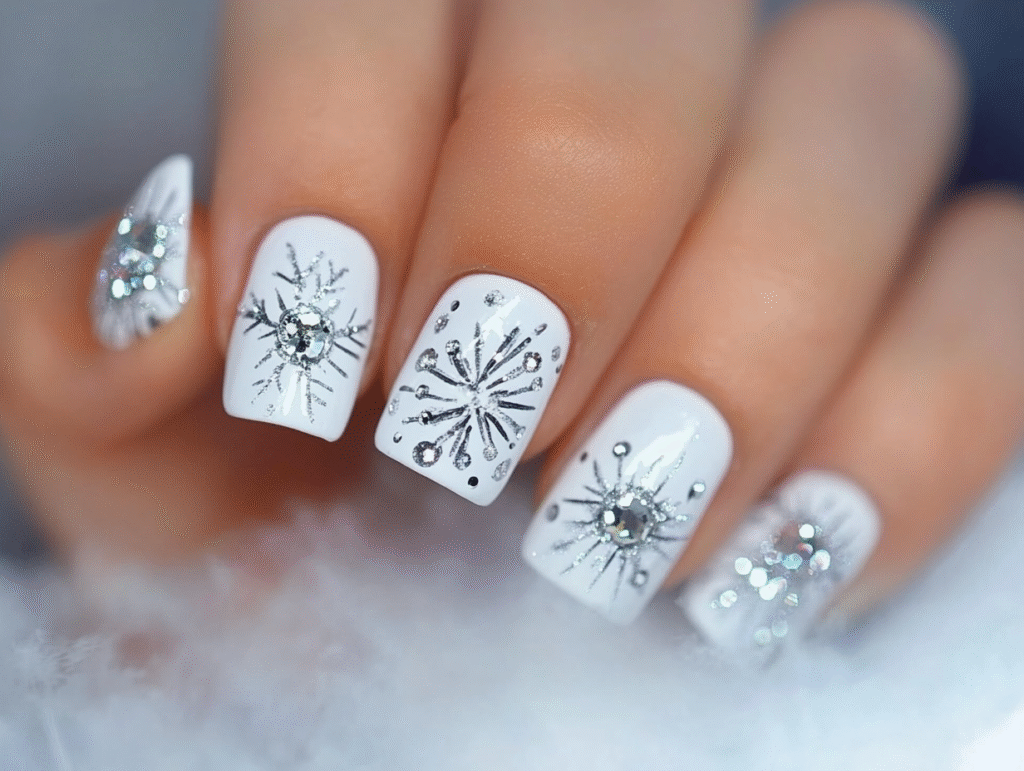 Snowflake patterns or icy crystal accents often complement the sparkles. These elements highlight the season’s beauty in a simple way. The mix of white and glitter shows elegance and a bit of fun.