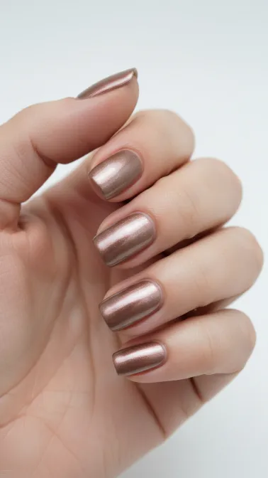 This look combines mocha polish with a cool chrome topper for a soft, iced-metal effect. It’s modern and shiny with a dreamy glow.