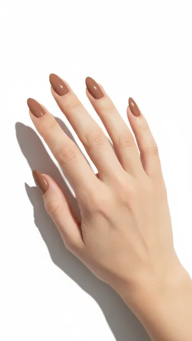 Soft mocha mousse color on almond-shaped nails creates an elegant, elongated look. It’s simple but feels luxurious and polished.