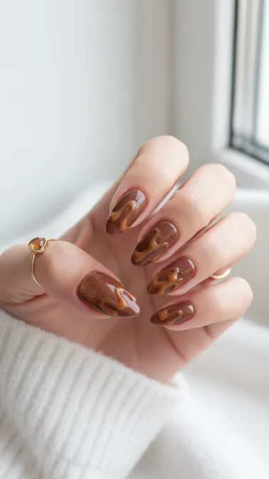 This design blends warm mocha velvet nails with soft caramel drip accents. It’s trendy, cozy, and perfect for anyone who loves sweet, dessert-inspired nail art. The mix of velvet and gloss gives it a rich, eye-catching finish.