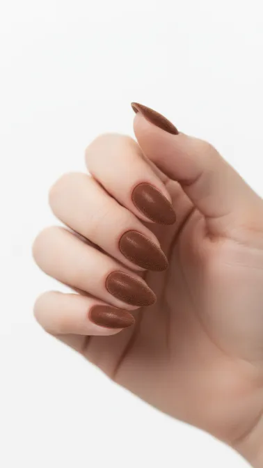 These almond-shaped nails feature a soft mocha mousse shade with a lush velvet texture. It’s feminine, clean, and perfect for anyone who wants a cozy yet classy look.