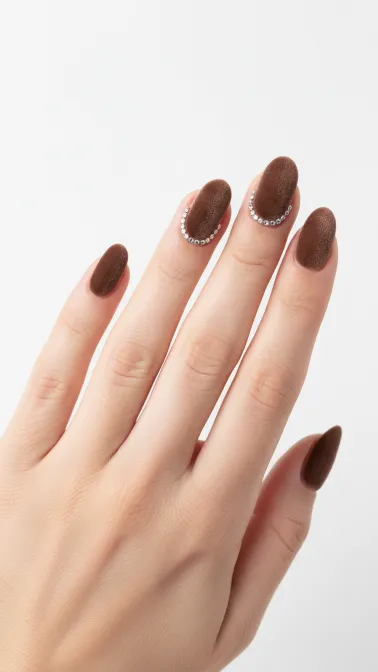 This look pairs the soft glow of velvet mocha nails with tiny rhinestones for a subtle sparkle. It’s elegant, easy to wear, and perfect for dinners, events, or holiday seasons. The rhinestones add just enough shine without overpowering the cozy vibe.