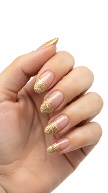Gold glitter tips give any nail a touch of instant glam. They sparkle beautifully under holiday lights and look amazing in photos. Perfect for quick festive nails without full coverage glitter.