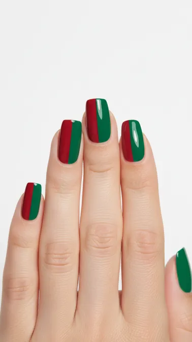 This fun half-and-half design gives classic Christmas colors a modern twist. It’s bold, trendy, and easy to achieve with tape. Perfect for holiday lovers who want something playful.