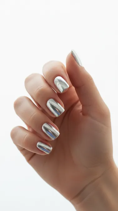 Silver chrome nails give a cool, icy holiday vibe. The finish looks high-end and futuristic. Great for anyone who loves bold, metallic looks.