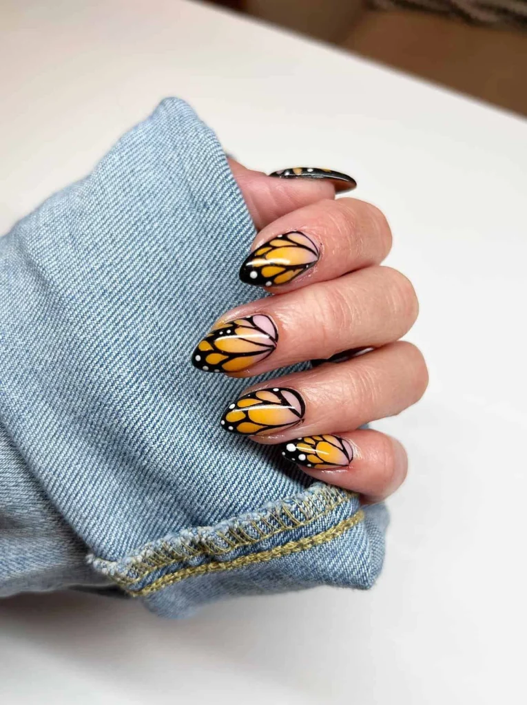 Bold orange nails with black wing-like outlines and tiny white dots create a striking monarch butterfly effect. This design is perfect for anyone who loves nature-inspired nail art that feels both artistic and powerful.