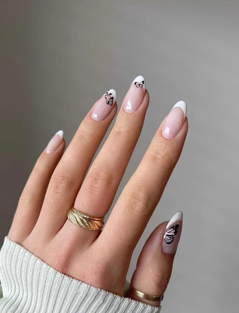 Best Nail Shape: Almond nails highlight the refined French tips and butterfly accents.