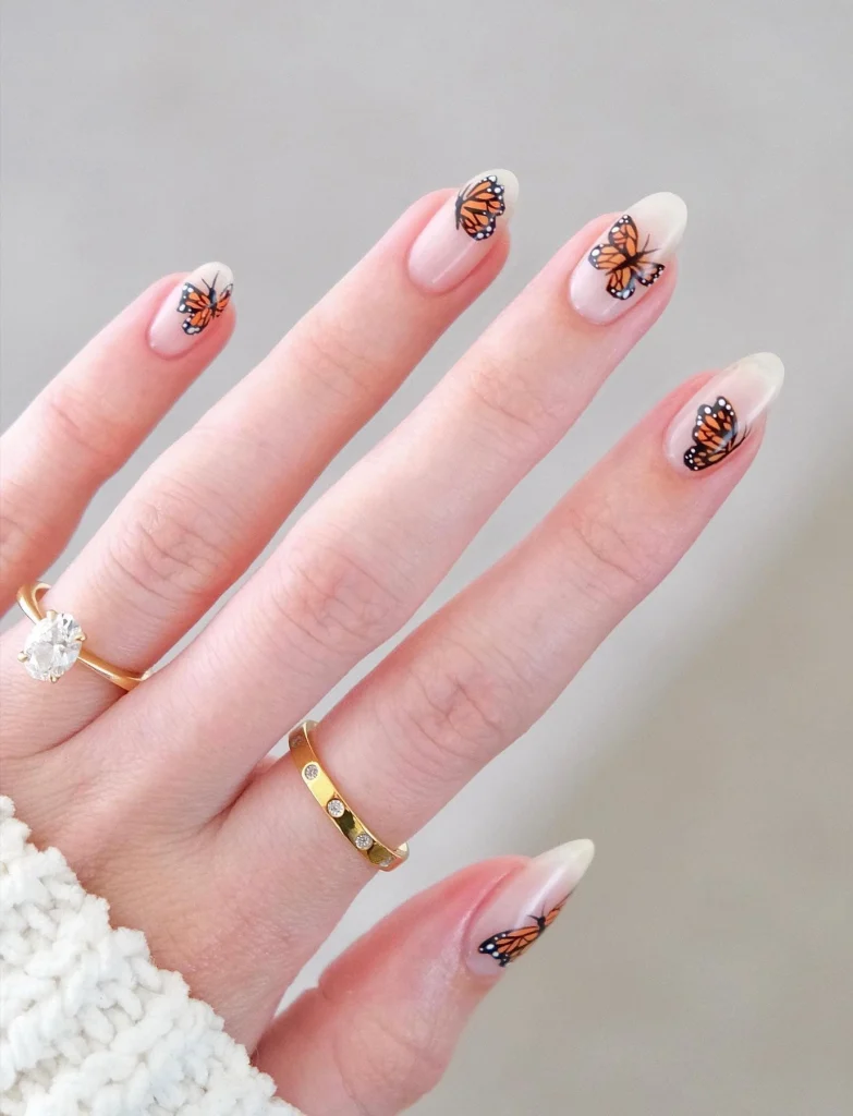 Best Nail Shape: Almond nails enhance the delicate butterfly detailing.