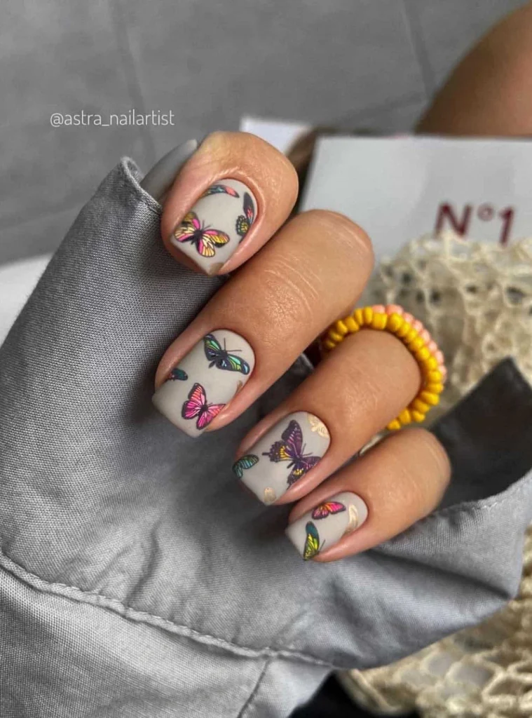 A soft gray matte base makes the perfect backdrop for colorful butterflies in pink, purple, yellow, blue, and green. Playful yet elegant, this design feels lively and artistic, ideal for anyone who loves bold nail art with a delicate twist.