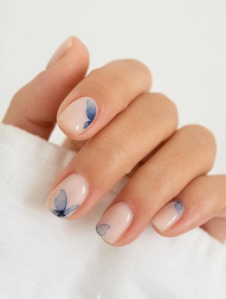 Light nude nails with delicate blue butterfly wing accents create a clean, minimalist look that still feels artistic. This design is perfect for anyone who loves subtle elegance with a touch of nature-inspired charm.