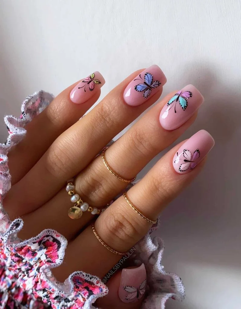 Soft pink nails become the perfect canvas for delicate butterflies in pastel shades of blue, purple, pink, and green. With fine black outlines and gentle detailing, this look feels whimsical, feminine, and ideal for anyone who loves dreamy, nature-inspired nail art.