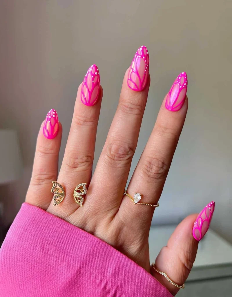 Bright pink nails with translucent sections and petal-like outlines create a soft, floral-inspired base, while tiny white dots add a delicate finishing touch. This design feels fresh, feminine, and perfect for anyone who loves playful butterfly-inspired nail art with a romantic twist.