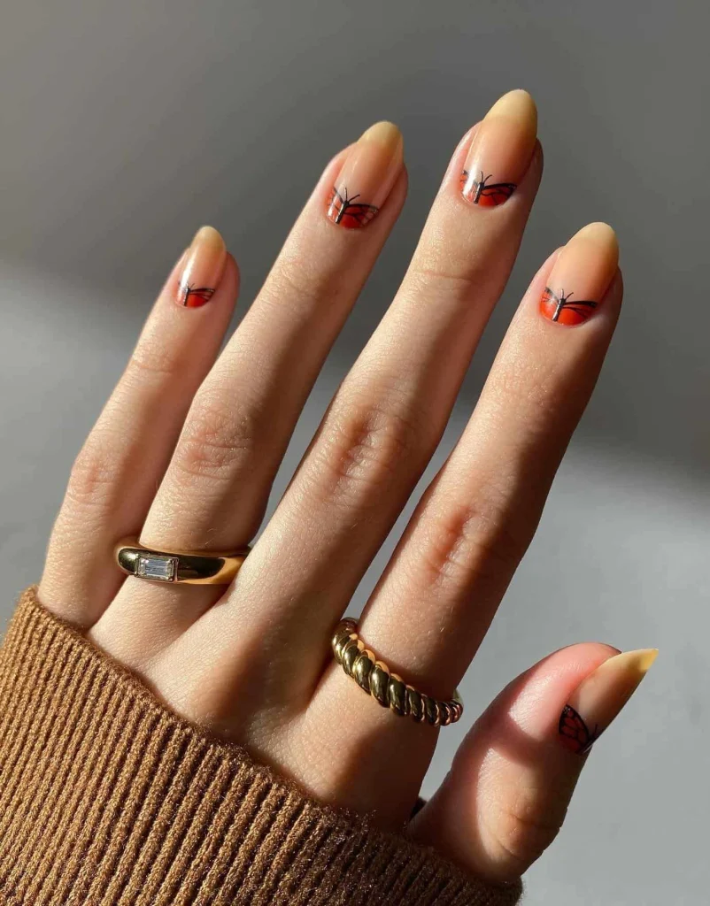 Best Nail Shape: Almond nails highlight the flowing gradient and butterfly details.