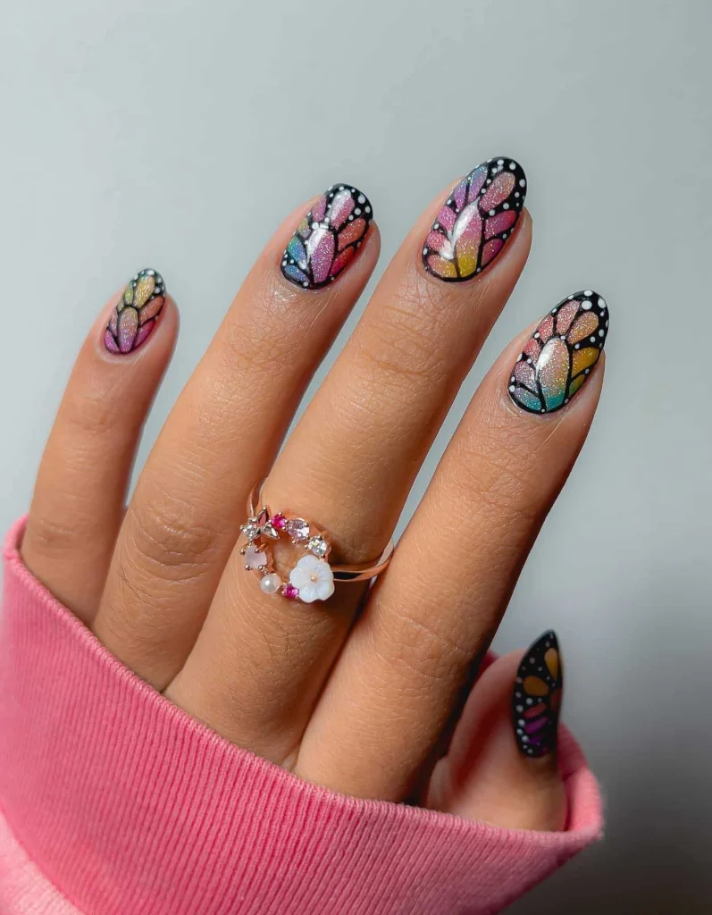 Best Nail Shape: Almond nails highlight the flowing butterfly wing accents beautifully.
