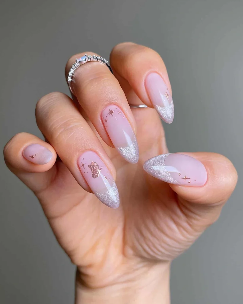 Soft pink nails with shimmering silver glitter tips create a modern French twist, while delicate stars and a butterfly accent add a dreamy, celestial vibe. This design is perfect for anyone who loves elegant sparkle with a touch of whimsy.