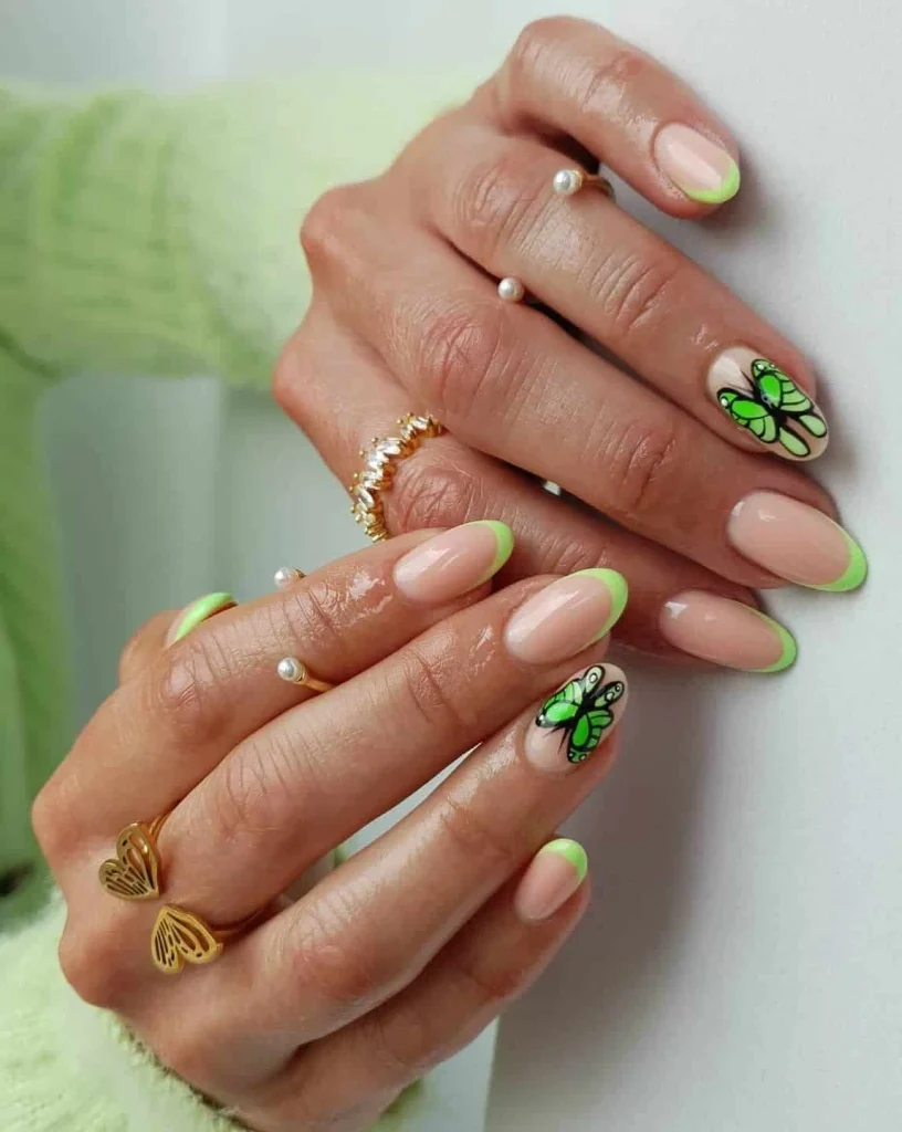 A nude base with bold neon green French tips makes this design pop, while butterfly accents in green and black add a nature-inspired twist. It’s a fresh, modern take on butterfly nails that’s perfect for anyone who loves playful yet chic styles.