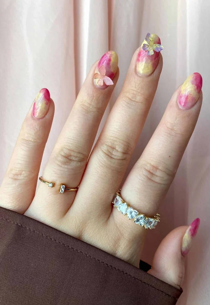 A dreamy blend of pink, yellow, and cream swirls creates a soft marbled base, while delicate butterfly accents add a whimsical touch. This design is perfect for spring lovers, festival goers, or anyone wanting nails that feel light, artistic, and Instagram-ready.