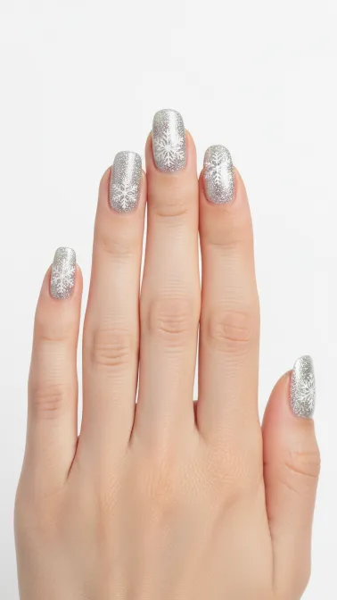 Sparkle all season with delicate snowflakes over a glittery base. This festive look adds a winter wonderland touch to your nails and is perfect for holiday parties. Easy to customize with your favorite glitter shades.