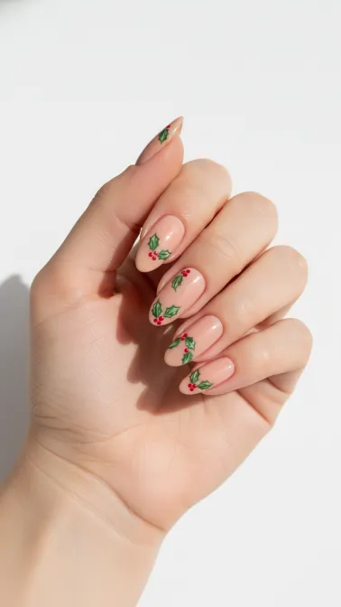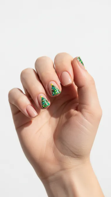 Subtle yet stylish, this design features small Christmas trees at the tips of your nails. Perfect for office-friendly holiday nails or a chic minimalist look.
