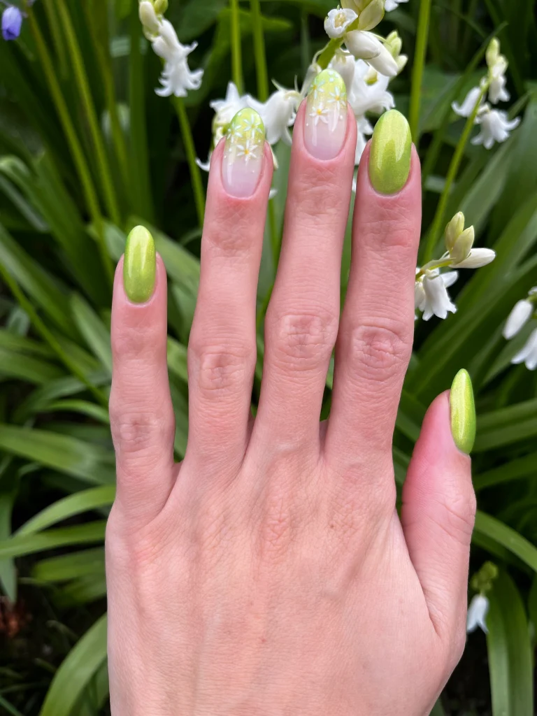 Best Nail Shape: Short oval or almond nails complement this soft botanical style.
