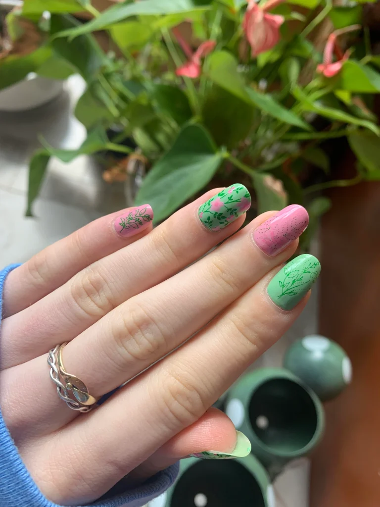 Pink Green Botanical Nails