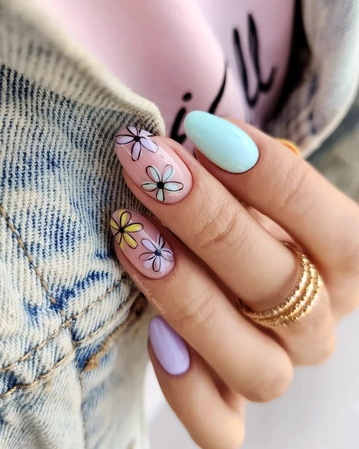 Soft pastel nails paired with outlined daisy-style flowers create a playful yet clean floral spring nails look. The mix of pink, lavender, and baby blue shades with simple black-outlined blooms makes this design trendy and eye-catching. Perfect for anyone who loves cute, artistic nail art with a modern twist.
