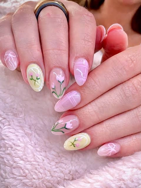 Sheer pink and pastel nails with delicate tulip accents create a dreamy floral spring nails look. The mix of soft swirls, light yellow tones, and tiny hand-painted flowers makes this design feel fresh, airy, and on-trend. Perfect for anyone who loves elegant, feminine nail art with a subtle artistic twist.