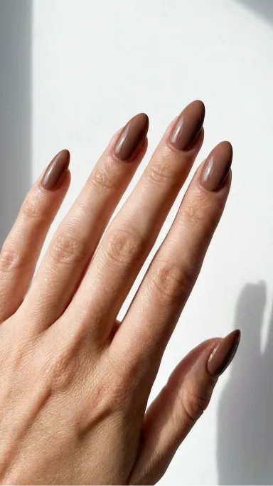 Almond nails add softness and elegance to mocha brown polish. This shape makes fingers look longer while keeping the design simple and refined. Great for anyone wanting subtle glamour.
