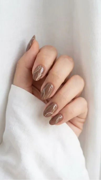 This design adds thin, delicate lines over a mocha brown base for a subtle artistic touch. It’s trendy, modern, and perfect if you want mocha brown nails that save time & look luxe without feeling overdone.