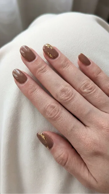 This design adds a small gold detail to mocha brown nails for a luxe touch. It’s simple but eye-catching, perfect for elevated everyday nails.