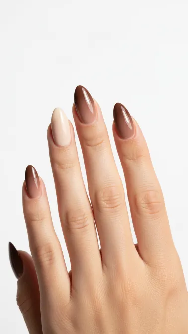 A chic combination of mocha brown and nude shades for a classy, modern look. Perfect for anyone who wants a stylish two-tone manicure.