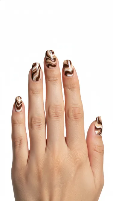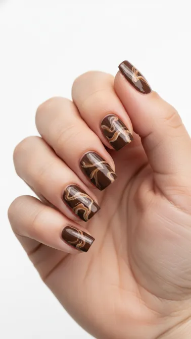This playful marble-inspired design blends mocha brown with creamy white tones. It’s perfect for those who love creative, coffee-themed nails without spending hours at a salon.