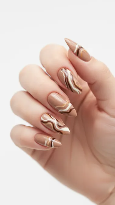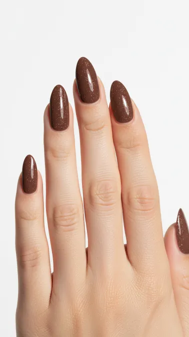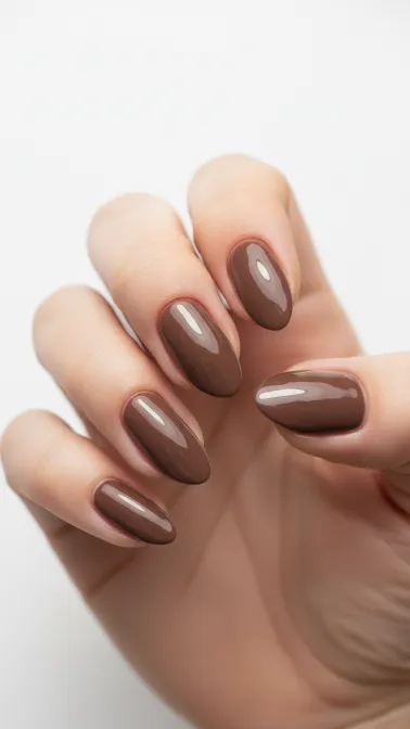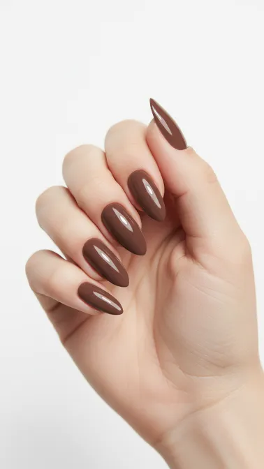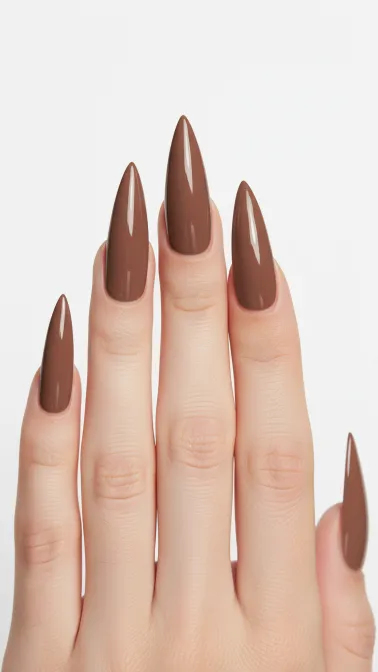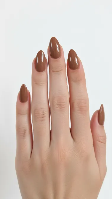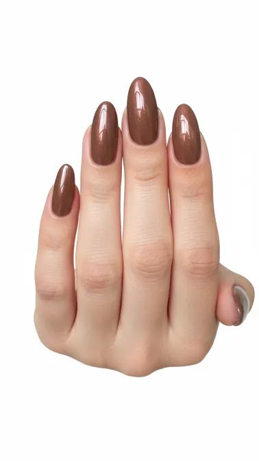 Almond-shaped mocha mousse nails are elegant and flattering. The soft, pointed tip elongates fingers, and the glossy finish makes the color pop. Perfect for both everyday style and special occasions.