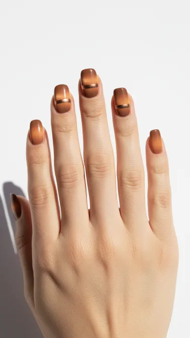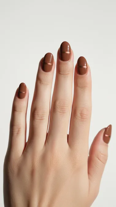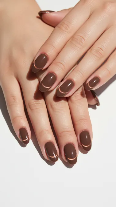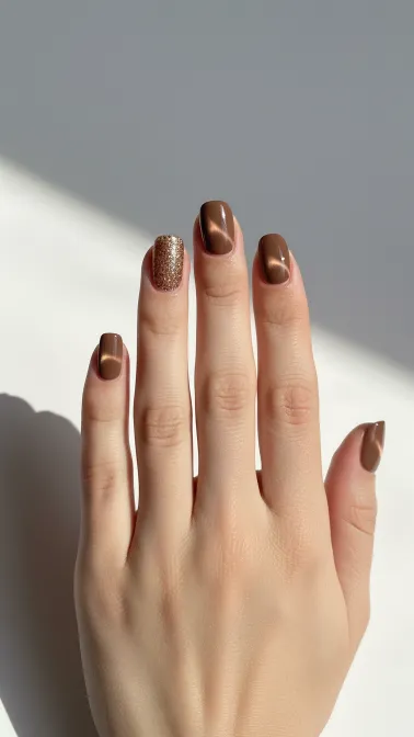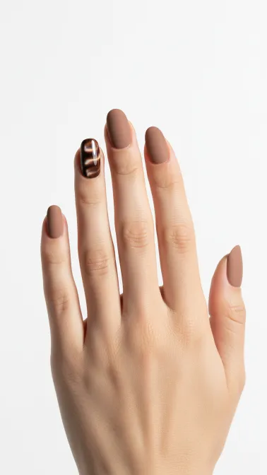 Short nails look extra cute with mocha mousse polish and a subtle cat eye line. This style is clean, modern, and perfect for someone who loves low-maintenance nail designs. It’s simple yet full of shine.