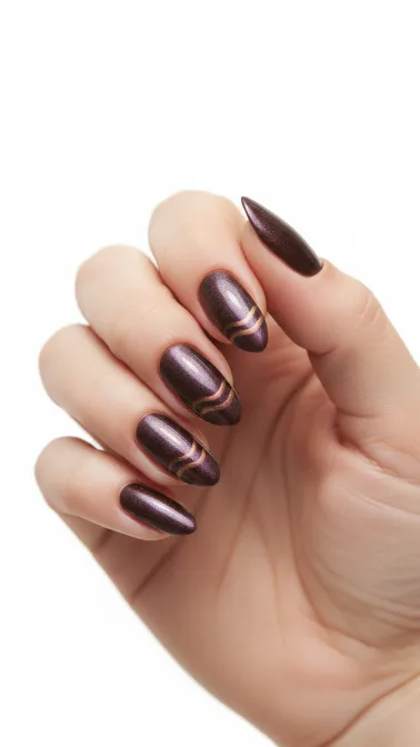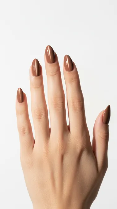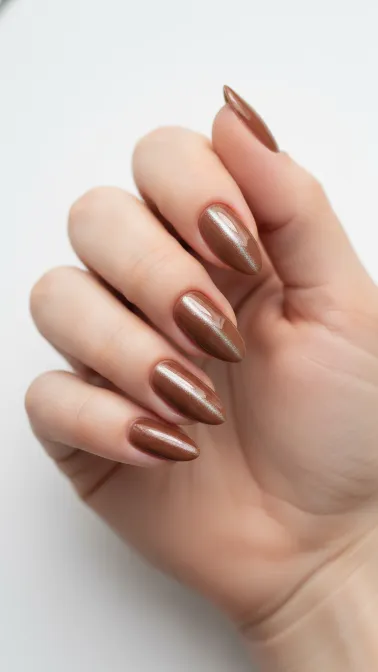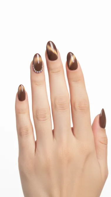 Oval nails paired with a mocha cat eye finish create a soft, feminine look. The shape adds elegance, while the shimmer adds depth. Great for anyone who loves natural-looking glam.