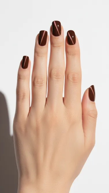 This design blends deep mocha tones with a chrome top layer for extra shine. The cat eye effect glows underneath, giving the nails a multidimensional look. Perfect for glam nights or winter nails.