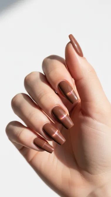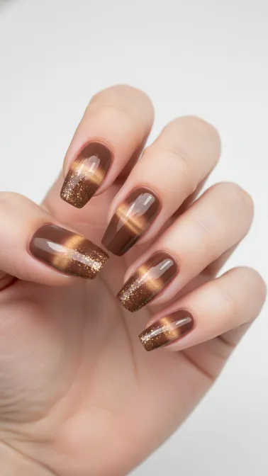 This design mixes sheer mocha tones with a delicate cat eye shimmer. It’s light, airy, and perfect for a clean-girl aesthetic. The soft glow makes your nails look fresh without being too bold.