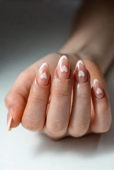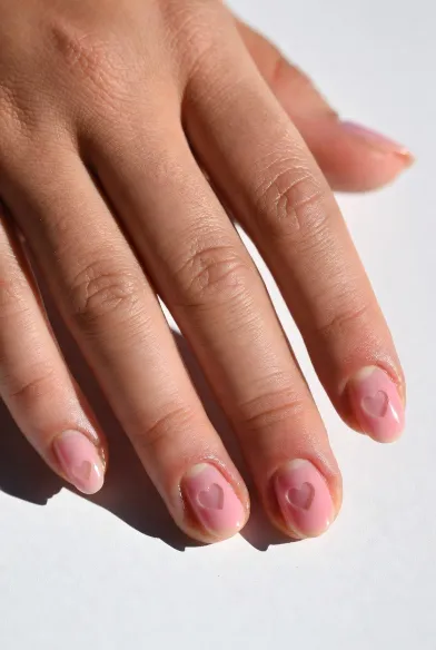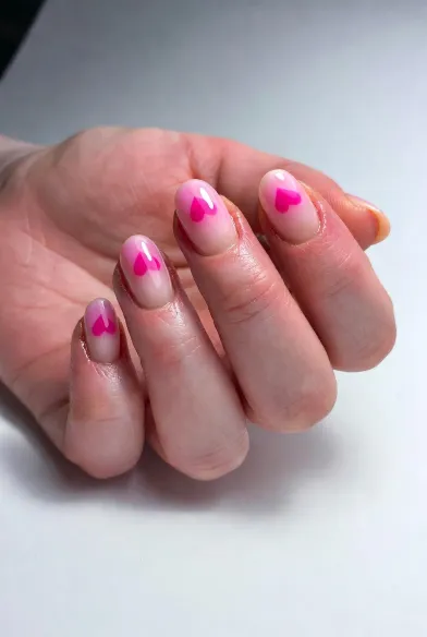 Soft pink fades into milky white with tiny heart accents that feel sweet and modern. This look is trending because ombré nails stay classy while hearts add a Valentine touch. Perfect for beginners who want cute but simple Valentine nails.