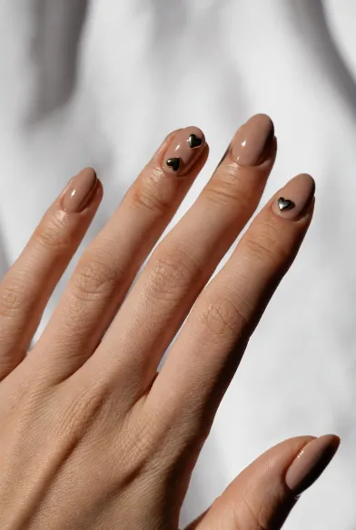 Shiny metallic hearts add instant glam to simple nails. This look is trending for its clean, modern finish that still feels festive. Ideal for minimal Valentine nail lovers.