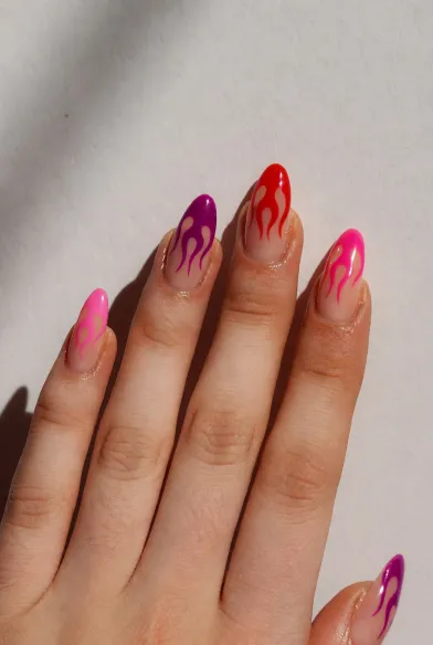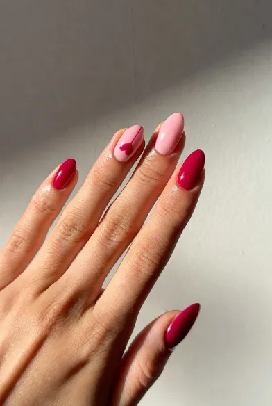 Mixing pink and red across different nails creates a fun, trendy Valentine look. This design is popular because it allows creativity without detail work. Great for quick Valentine manicures.