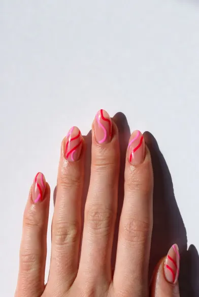 Loose squiggly lines in Valentine colors create a fun, artsy look. This style is trending because it doesn’t require precision. Perfect for easy Valentine nail art at home.