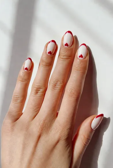 This design mixes two Valentine colors with heart-shaped tips. It’s a fresh twist on French tips and very beginner-friendly. Perfect if you want simple Valentine nail art that looks unique.