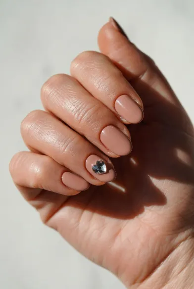 A single rhinestone heart creates instant sparkle with minimal effort. This look is trending for its clean, glam finish. Perfect for simple but bold Valentine nails.