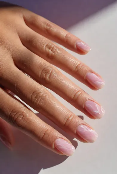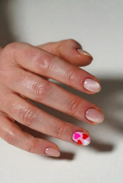 A simple shimmer base paired with heart stickers makes this design almost effortless. This style is trending because it saves time while still looking festive. Ideal for quick at-home Valentine nails.