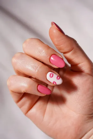 Tiny lip prints on a soft pink or white base feel fun and flirty. This look is trending on social platforms for its playful Valentine vibe. Great for beginners who like nail stickers or simple art.
