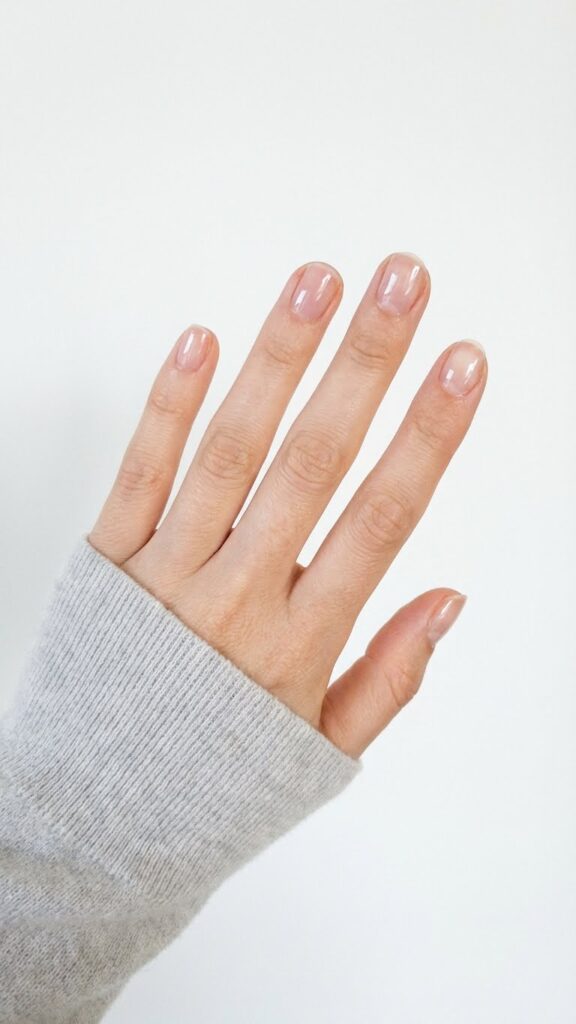 This look focuses on shine and simplicity. Barely-there nails are perfect when you want clean beauty all winter.